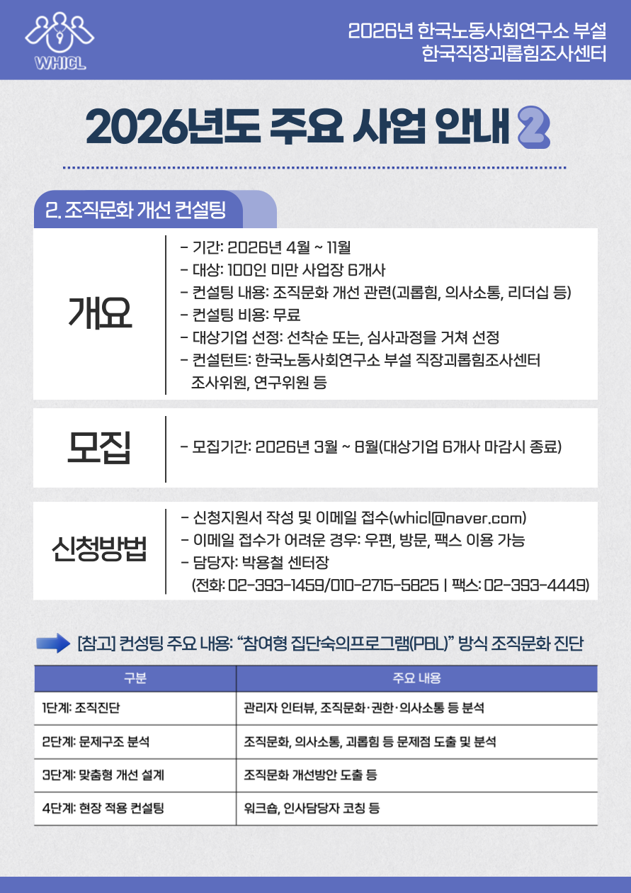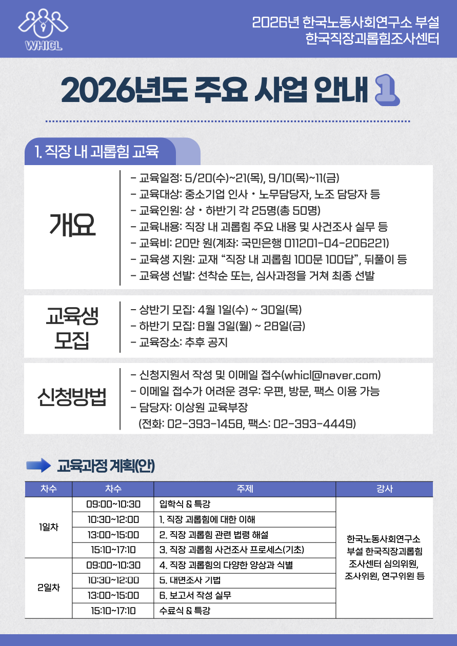 연구소 부설 한국직장괴롭힘조사센터 '2026년도 주요 사업 안내' (교육/컨설팅)