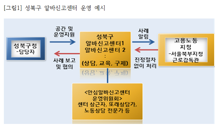 성북구가 할 수 있는 구체적인 사업 중 알바신고센터의 실질적인 운영을 제안한다. 새로운 사업을 만들기보다는 정부에서 이미 마련한 제도가 자치구에 잘 정착할 수 있도록 힘을 쏟는 것이 중요하다.