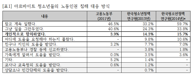 ❏ 일하면서 겪는 노동권 침해: 일하면서 겪는 노동권 침해 사항은 △근로계약서를 작성하지 않거나 실제 노동조건과 다른 근로계약서 작성, △최저임금 미달과 수습기간 임금 삭감, △‘꺾기’와 무급 노동으로 인한 실지적인 임금 삭감, △장시간 노동과 휴식시간 미부여 등 사업주의 노동관계법 위반으로 인한 피해, △막말과 무시 등 인격적 괴롭힘 등이었다.