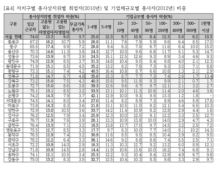 ❏ 성북구의 일자리는 중소업체의 비공식성이 강한 일자리: 성북구의 일자리 특성은 중소규모의 비공식성이 강한 일자리라고 볼 수 있다. 주로 동대문구의 섬유업체들에 연결된 5인 미만 하청 봉제업체들로 장시간노동에 기반해 인건비를 아껴서 이윤을 남기는 곳이다 보니, 청소년을 쓸 이유가 별로 없다고 했다. 또한 5인 미만의 영세한 업체에 비해 규모가 있거나 안정적인 일자리에는 청소년보다 대학생을 선호한다고 응답했다. 이런 상황에서 청소년 일자리를 만들려면 구청에서 기업에 장기적으로 지원을 하는 등의 사업이 필요할 것이라 지적했다.