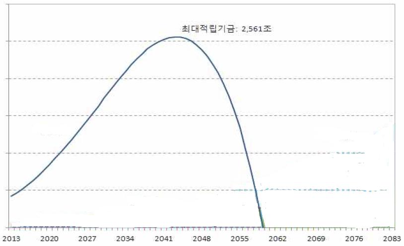 국민연금 장기재정추계 분석에 따르면, [그림1]에서 보듯이 현행 국민연금 제도가 그대로 유지될 경우 기금은 2040년 중반까지 쌓이다가 이후 수급자가 늘어남에 따라 빠른 속도로 줄어 2060년에 소진될 전망이다. 만약 2060년에 당시 가입자 보험료만으로 수급자에게 국민연금을 지급한다면 필요보험료율은 21.4%에 달한다.