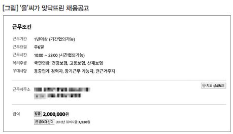 ‘을’씨는 직장을 구하기 위해 구직사이트에 접속한다. 사이트는 지역별, 기간별, 테마별로 검색할 수 있게 구성되어 누구든 쉽게 일자리를 찾을 수 있다. 서울을 선택해, 세부 지역과 업종, 근무기간, 근무요일을 고른다. 조금 덜 쉬더라도 돈을 벌고 싶기에 ‘1년 이상’, ‘주 6일’을 택한다. 프리미엄(광고비를 많이 낸) 채용정보를 지나 한 음식점의 채용정보를 클릭한다. 10시~23시 근무, 복리후생으로 ‘국민연금, 건강보험, 고용보험, 산재보험’이 적혀있는데 한 달 월급은 2백만 원이란다. 이상하다. 4대 보험을 복리후생이라 적은 것은 그렇다 치더라도 최저임금 위반2)이다.