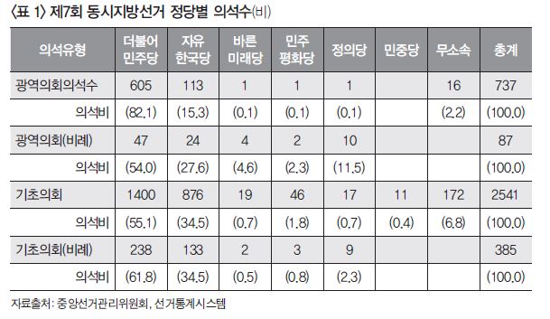 물론 진보정당들이 이번 지방선거에서 보여준 노력이나 성과를 단순히 공천자 또는 당선자의 규모로만 환원시킬 수는 없다. 이미 앞서 언급하였듯이 정의당은 8.97%의 득표율을 광역비례대표선거에서 얻었으며, 이는 바른미래당이나 민주평화당이 각각 7.81%와 1.52%의 득표율에 그친 것을 고려할 때 결코 무시할 만한 것은 아니다. 그리고 이러한 성과는 정의당이 박근혜 정부 시기 강제해산된 통합진보당을 대신하여 진보진영을 대표하는 정당으로 성장하고 있다는 것을 분명히 보여주는 것이다. 의석수만 보더라도 지난 제6회 동시지방선거에서 민중당의 전신이었던 통합진보당이 3명(비례대표 3명)의 광역의원과 34명(비례 3명)의 기초의원을 당선시킨 것과 비교하여 크게 뒤쳐지지 않는 성과라고 할 수 있다.