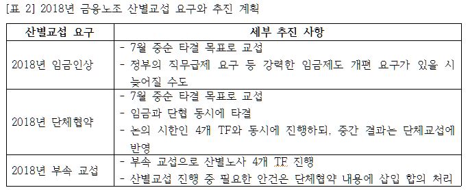 2018년은 금융노조에게 임금인상과 단체협약을 위한 교섭이 있는 해이다. 그러나 2016년 산별교섭 중에 지부 사용자들의 ‘금융산업사용자협의회(이하, 금사협)’ 탈퇴로 2016년 단체협약을 체결하지 못했다. 2017년에는 산별복원이라는 큰 성과를 얻었으나, 시간이 촉박하여 임금 타결 외에 2016년에서 넘어온 단체협약을 진행하지 못했다. 따라서 2018년 산별교섭에서는 단체협약 내용에 신중을 기해야 하는 상황이다.