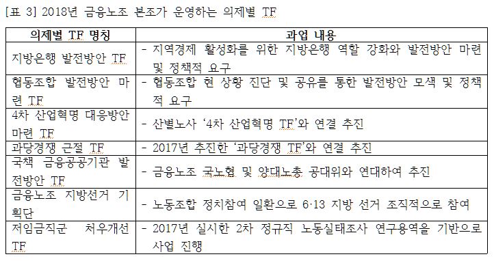 또한, 2017년 10월23일 금융 노사는 대표자회의에서 산별교섭 복원에 합의하면서 산별교섭 재개 후 금융산업 발전을 위한 태스크포스(TF)를 구성하기로 합의했다. 금융산업 주요 현안에 대한 심도 깊은 연구와 노사 간 대화를 통하여 노사 간 신뢰관계를 구축하고, 당면한 금융환경의 격변에 대응하기 위한 것임이다. TF의 의제는 △과당경쟁 방지 △4차 산업혁명 대비 고용안정 △임금체계 개선 △산별교섭 효율화 등이다. 운영기간은 2018년 말까지(상황에 따라 변경 가능)이고, 조직구성은 총괄반(노사 각 6명)과 실무반(노사 각 6명)으로 나누어 4개 소위를 구성할 예정이다. 금융노조 본조 집행부에서는 현안 업무를 효율적으로 추진하기 위하여 [표 3]과 같이 TF를 구성하여 운영하기로 했다.