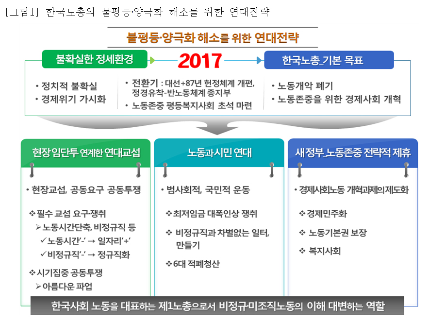 2017년은 대선 공간이라는 역동적 정치 지형과 맞물려 87년 헌정체계의 개편을 앞둔 전환기이자, 보수권력-친재벌 간의 정경유착-반노동체계를 심판하고, 이명박근혜 9년간 보수정권의 반노동정책을 청산하며, 노사관계 질서 회복과 노동존중 평등복지사회를 위한 초석을 마련해야 할 중대한 시점이다.