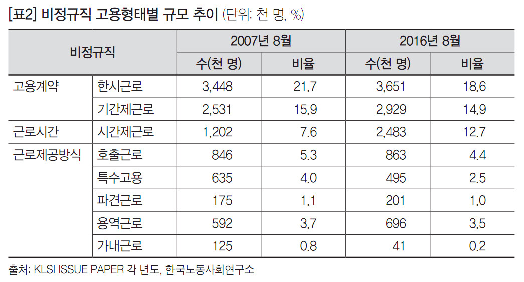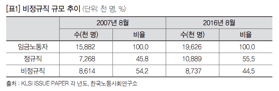 통계청이 2007년 8월에 실시한 ‘경제활동인구조사 부가조사’에서 비정규직은 861만 명(임금노동자의 54.2%), 정규직은 726만 명(45.8%)으로, 비정규직 규모가 전체 노동자의 절반 이상을 차지했다. 2016년 8월 기준 비정규직은 873만 명(44.5%), 정규직은 1,089만 명으로(55.5%) 집계됐다. 통계적으로 전체 임금 노동자 중에서 정규직의 비율은 늘었으나, 비정규직은 10년 동안 큰 변동 없이 비슷한 규모를 유지했다. ‘비정규직 규모’ 축소와 ‘불합리한 차별’ 해소를 목적으로 시행된 비정규직법이 이중화된 노동시장 구조를 전혀 개선하지 못했음을 비정규직 규모의 변화 추이를 통해 확인할 수 있다.