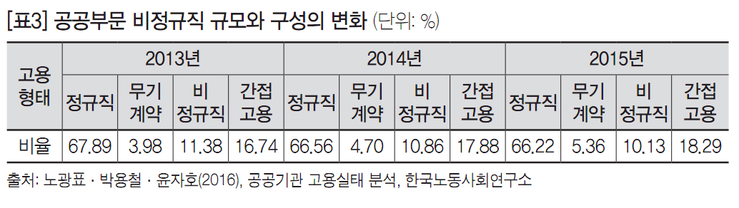 공공부문 비정규직 규모도 전체 추이가 크게 다르지 않다. 통상 공공기관의 고용형태는 정규직, 무기계약직, 비정규직, 소속 외 인력으로 구성된다. 2015년 346개 공공기관에서 일하고 있는 인력은 모두 합해 41만 2,587명이다. 이중 상임임원은 803명, 정규직은 27만 2,679명(66%), 무기계약직은 2만 2,069명(6%), 직접고용 비정규직은 4만 1,729명(10%), 그리고 간접고용 인원인 소속 외 인력은 7만 5,307명(18%)이다. 정부는 비정규직 문제 해결에 공공부문이 솔선수범하여 민간부문을 선도한다는 취지에서 2011년부터 2014년까지 해마다 ‘공공부문 비정규직 고용개선’ 대책을 발표했고, 주된 내용은 기간제 노동자들의 무기계약직 전환과 처우개선에 관한 사항이었다. 그러나 정부의 공공부문 비정규직 대책은 한마디로 생색내기 면피용에 불과했다. 2012년부터 2015년까지 일정 규모의 무기계약직 전환이 이행되어 비정규직 규모가 일부 줄었지만 파견‧용역, 사내하도급 형태의 간접고용은 증가했다. 그뿐만 아니라 정규직으로 포장된 새로운 차별적 고용형태인 무기계약직 노동자를 양산했다.