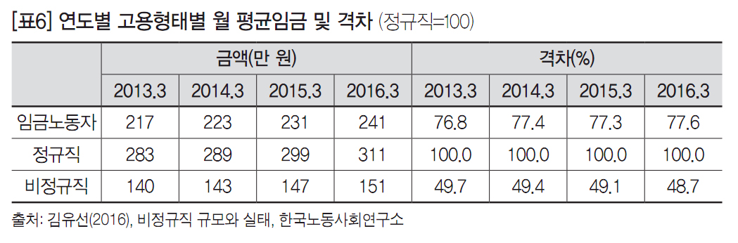 지난 10년간 정규직과 비정규직의 임금 격차는 오히려 확대됐다. 연도별 임금 격차를 비교한 결과 2007년 8월 기준 비정규직의 월평균 임금은 정규직 대비 50.5%, 2016년 8월에는 49.2%로 집계됐다. 그뿐만 아니라 임금 불평등도 심화됐다. 경제활동인구조사 부가조사에서 전 산업 월 임금총액 평균값을 계산하여 알아본 결과 상위 10%와 하위 10% 임금격차(P9010)는 2007년 5.16배에서 2016년 5.63배로 증가했다. 가장 심각한 것은 성별 고용형태별 임금격차다. 2016년 3월 여성의 시간당 임금은 남성 임금의 65.5%이며, 남녀 고용형태별로 분류할 경우 여성비정규직은 남성 정규직 임금에 비해 43.2%에 불과하여 비정규직 여성에 대한 차별이 가장 심각한 것으로 드러났다. 이러한 이유 중의 하나는 여성의 일자리가 대부분 ‘시간제 일자리’로 확충되었기 때문이다. 실제 지난 10년 동안 시간제 일자리는 두 배 이상 증가했는데, 남성의 비율은 32.5%에서 28.6%로 감소한 반면 여성은 67.5%에서 71.4%로 증가했다.