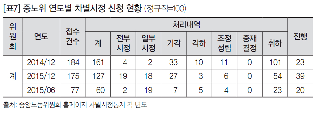중노위 차별시정통계에 의하면, 지난 2년간(2014.12∼2015.12) 노동위원회에 접수된 차별시정신청은 359건이며 288건이 처리되었다. 처리 사건 중 시정 조치는 43건, 14.9%에 불과하다. 나머지 사건들은 기각, 각하 또는 취하되었다. 그뿐만 아니라 노동위원회가 노동자 쪽 요구를 모두 받아들이는 ‘전부 시정’ 판정 사건은 23건으로, 7%에 그쳤다. 결론적으로 비정규직 노동자가 임금 및 근로조건 차별을 해결하기 위해 차별시정제도를 잘 활용하지 않고 있으며, 실제 차별시정을 접수하더라도 비정규 노동자의 요구대로 시정 조치가 이루어지지 않고 있다.