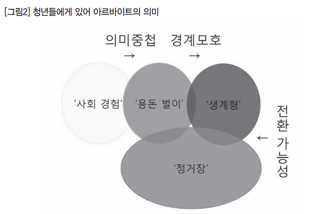 청년들의 아르바이트 일자리 이동 실태조사 결과, 취업준비 기간 및 생계형 아르바이트가 장기화 될수록 비정규직과 같은 주변부 고용 증가가 높아지고 있다는 함의를 얻을 수 있었다. 청년들에게 아르바이트는 주로 ‘치고 빠지는’ 식의 단기 아르바이트로 인식되는데, 특히 낮은 최저임금은 단기 아르바이트를 통한 생활비(용돈) 보충 수단에 불과한 것으로 인식되고 있었다.