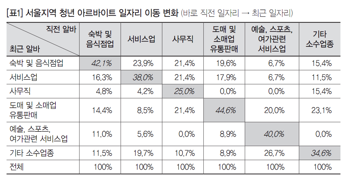 또한 정규직에서 아르바이트로의 일자리 이동도 확인된다. 정규직으로 일하던 청년이 근로조건과 직장문화에 대한 불만으로 일을 그만 둘 경우, 진로 재탐색과 사회 경험을 쌓기 위해 아르바이트를 하고 있는 것이다.