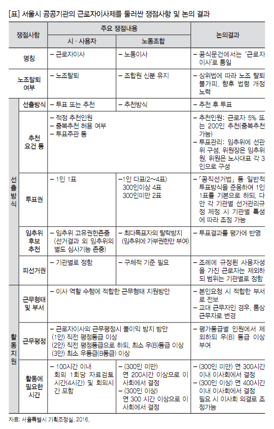서울시 공공기관에서 도입하려는 근로자이사제를 둘러싼 노사 간의 쟁점사항과 논의 결과를 정리하면 [표]와 같다.