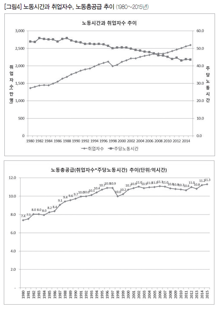 [그림4]에서 노동시간 단축이 고용유지·창출에 미치는 영향을 살펴보자. (위쪽 그림)에서 취업자 수는 1980년 1,368만 명에서 2015년 2,594만 명으로 꾸준히 증가하고 있다. 주당 노동시간은 1988년 55.8시간에서 2015년 43.6시간으로 12.2시간 감소했다. (아래쪽 그림)에서 노동총공급(취업자수*주당노동시간)은 1980년 7.4억 시간에서 1996~97년 10.9억 시간으로 증가한 뒤, 2001년(10.9억 시간)부터 2015년(11.3억 시간) 사이에는 같은 수준을 유지하고 있다. 이것은 2000년대에 주40시간(5일) 근무제를 도입하지 않았다면, 지금보다 취업자 수는 훨씬 적고 실업자 수는 훨씬 많았을 것임을 말해준다.
