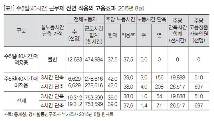 5인 미만 사업체(시행령 별표1)와 적용제외 산업(근기법 제63조)은 주5일(40시간) 근무제가 적용되지 않는다. [표2]는 5인 미만 사업체와 농림어업, 감시단속적 근로자를 제외하고 현행법대로 주5일(40시간) 근무제를 적용했을 때 실노동시간 단축효과와 고용창출효과를 추정한 결과다.