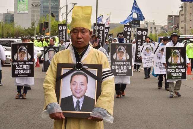 (4월16일 '현대차 정몽구 회장 처벌, 한광호 열사 정신 계승 범국민대회' 참가자들이 한광호 열사 영정을 앞세우고 행진 중이다. ⓒ금속노동자 김경훈)
