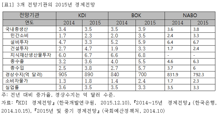 우리 사회가 이 도전을 제대로 넘을 수 있을지는 아무도 알 수 없다. 다만 적어도 몇 가지 비상한 수단은 지금 당장 써야 한다. 이 글에서는 2015년에 당장 우리가 집중해야 할 우리 사회의 경제 문제를 살펴보기로 하자. 우선 제2절에서는 내년도 경제전망을 간단히 개관하고, 제3절에서 내년도 정책 과제를 점검해 보기로 한다.