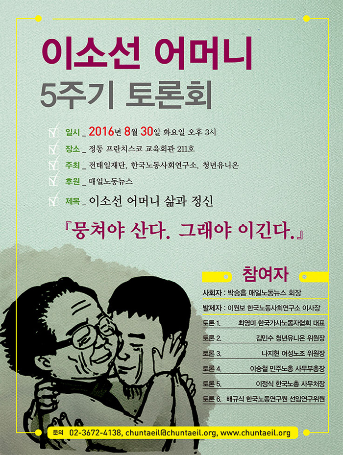 한국노동사회연구소는 이소선 어머니 5주기를 맞아 오는 8월 30일 오후 3시에 서울 중구 정동 프란치스코 교육회관 211호에서 토론회 '이소선 어머니 삶과 정신 『뭉쳐야 산다. 그래야 이긴다.』'를 개최합니다.
